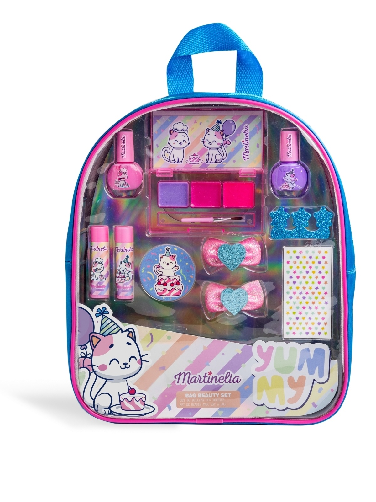Naudojimas: žiūrėti ant pakuotės.MARTINELIA YUMMY BAG BEAUTY SET LIP BALM COCONUT: PARAFFINUM LIQUIDUM (MINERAL OIL). POLYISOBUTENE. ETHYLHEXYL PALMITATE. MICROCRYSTALLINE WAX. HYDROXYSTEARIC ACID. ISONONYL ISONONANOATE. PARFUM (FRAGRANCE). PHENOXYETHANOL. BENZYL ALCOHOL. MAY CONTAIN +/- [CI 77891 (TITANIUM DIOXIDE). CI 45410 (D&C RED NO. 27 AL LAKE). CI 15850 (D&C RED NO. 6 BA LAKE)]./ MARTINELIA YUMMY BAG BEAUTY SET LIP BALM STRAWBERRY: PARAFFINUM LIQUIDUM (MINERAL OIL). POLYISOBUTENE. ETHYLHEXYL PALMITATE. MICROCRYSTALLINE WAX. HYDROXYSTEARIC ACID. ISONONYL ISONONANOATE. PARFUM (FRAGRANCE). PHENOXYETHANOL. LIMONENE. MAY CONTAIN +/- [CI 77891 (TITANIUM DIOXIDE). CI 45410 (D&C RED NO. 27 AL LAKE). CI 15850 (D&C RED NO. 6 BA LAKE)]./ MARTINELIA YUMMY BAG BEAUTY SET LIP GLOSS: PARAFFINUM LIQUIDUM (MINERAL OIL). POLYISOBUTENE. ETHYLHEXYL PALMITATE. ISOPROPYL MYRISTATE. MICROCRYSTALLINE WAX. POLYETHYLENE. HYDROXYSTEARIC ACID. SYNTHETIC FLUORPHLOGOPITE. PARFUM (FRAGRANCE). PHENOXYETHANOL. LIMONENE. BENZYL BENZOATE. CITRAL. EUGENOL. MAY CONTAIN +/- [CI 77891 (TITANIUM DIOXIDE). CI 45410 (D&C RED NO. 27 AL LAKE). CI 42090 (FD&C BLUE NO. 1 AL LAKE). CI 15850 (D&C RED NO. 6 BA LAKE). CI 15850:2 (D&C RED NO. 7 CA LAKE)]./ MARTINELIA YUMMY BAG BEAUTY SET WATER NAIL POLISH: AQUA (WATER). STYRENE/ACRYLATES COPOLYMER. POLYACRYLIC ACID. PROPYLENE GLYCOL. SILICA. PHENOXYETHANOL. PARFUM (FRAGRANCE). LIMONENE. CITRAL. MAY CONTAIN+/- [CI 77742 (MANGANESE VIOLET). CI 15850 (D&C RED 6 NA SALT)].