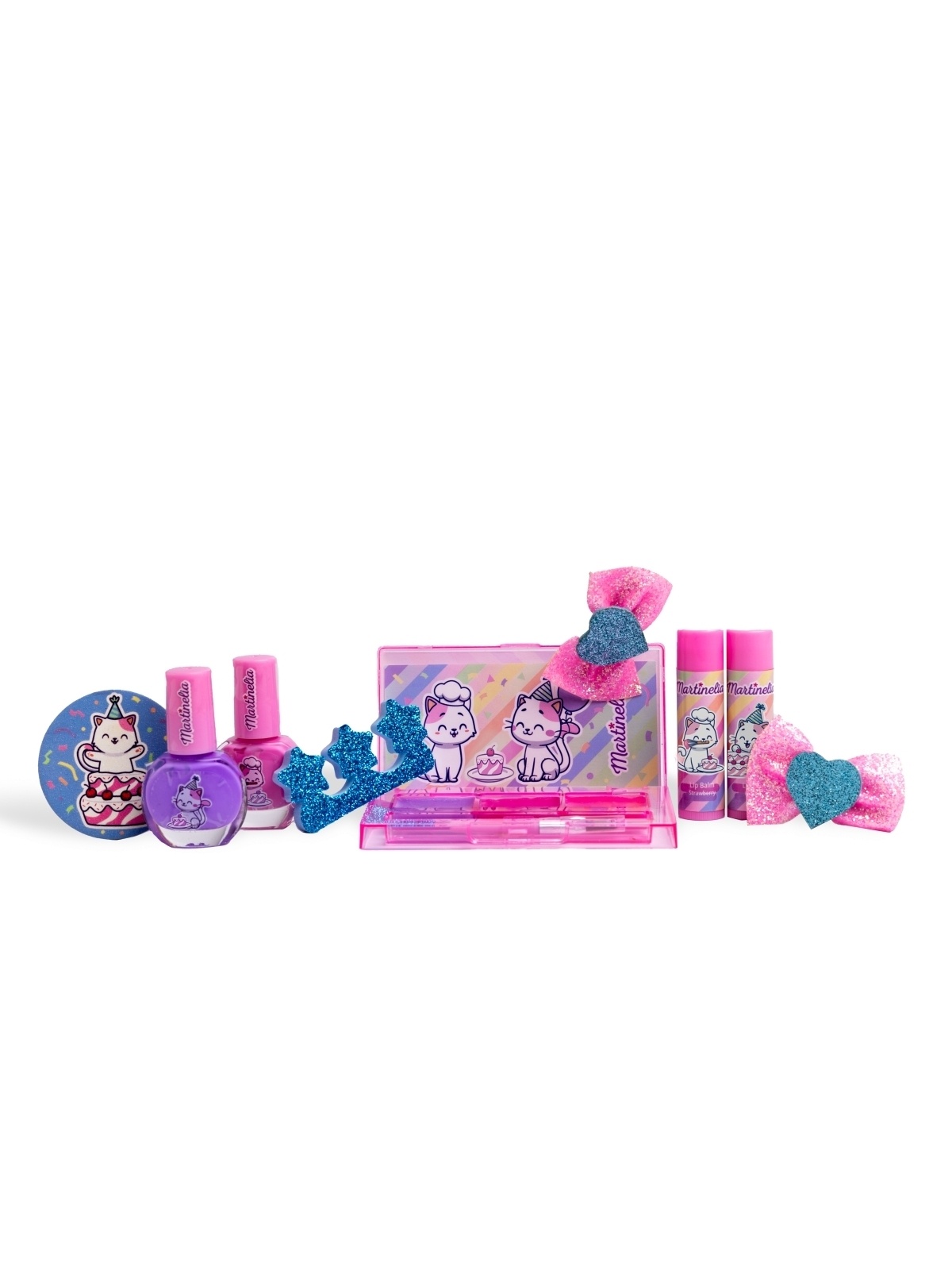 Rinkinį sudaro: nagų lakai (2 vnt.), lūpų balzamai (2 vnt.), plaukų segtukai (2 vnt.), pirštų skirtukai, nagų dildė, lūpų blizgesio paletė (3 spalvos + aplikatorius), lipdukai.