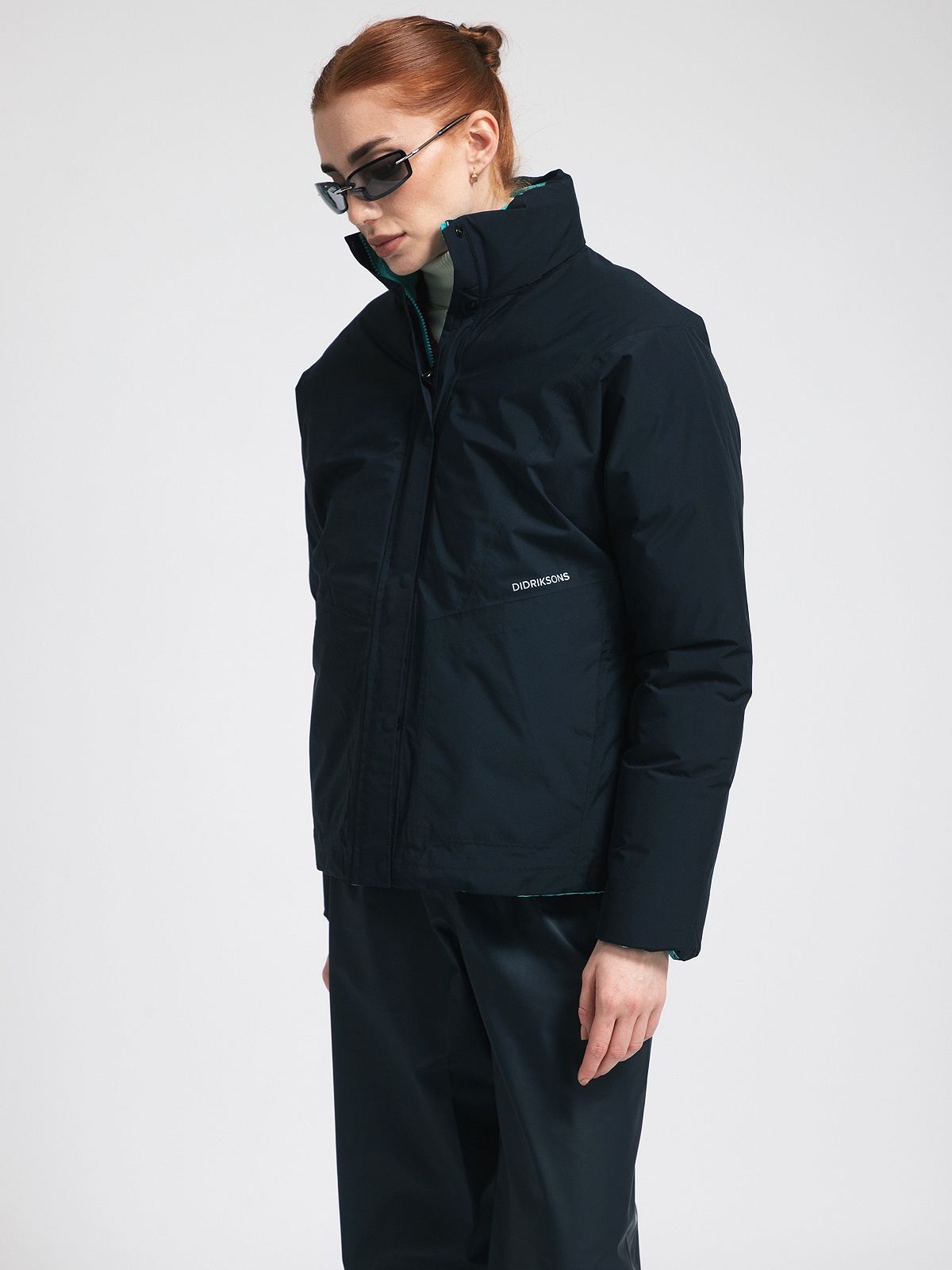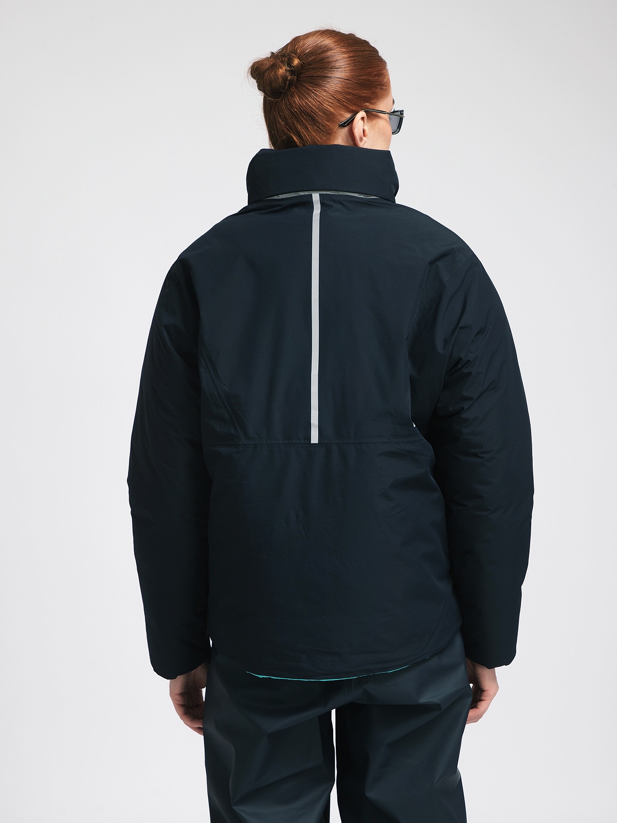 Kai striukė dėvima lygia puse į išorę, ji yra “oversized fit”. Striukės apačia reguliuojamo siaurumo, paminkštintoje pusėje striukė turi viso ilgio priekinį užtrauktuką su apsauginiu atvartu, lygioje pusėje ji užsegamą saga.
